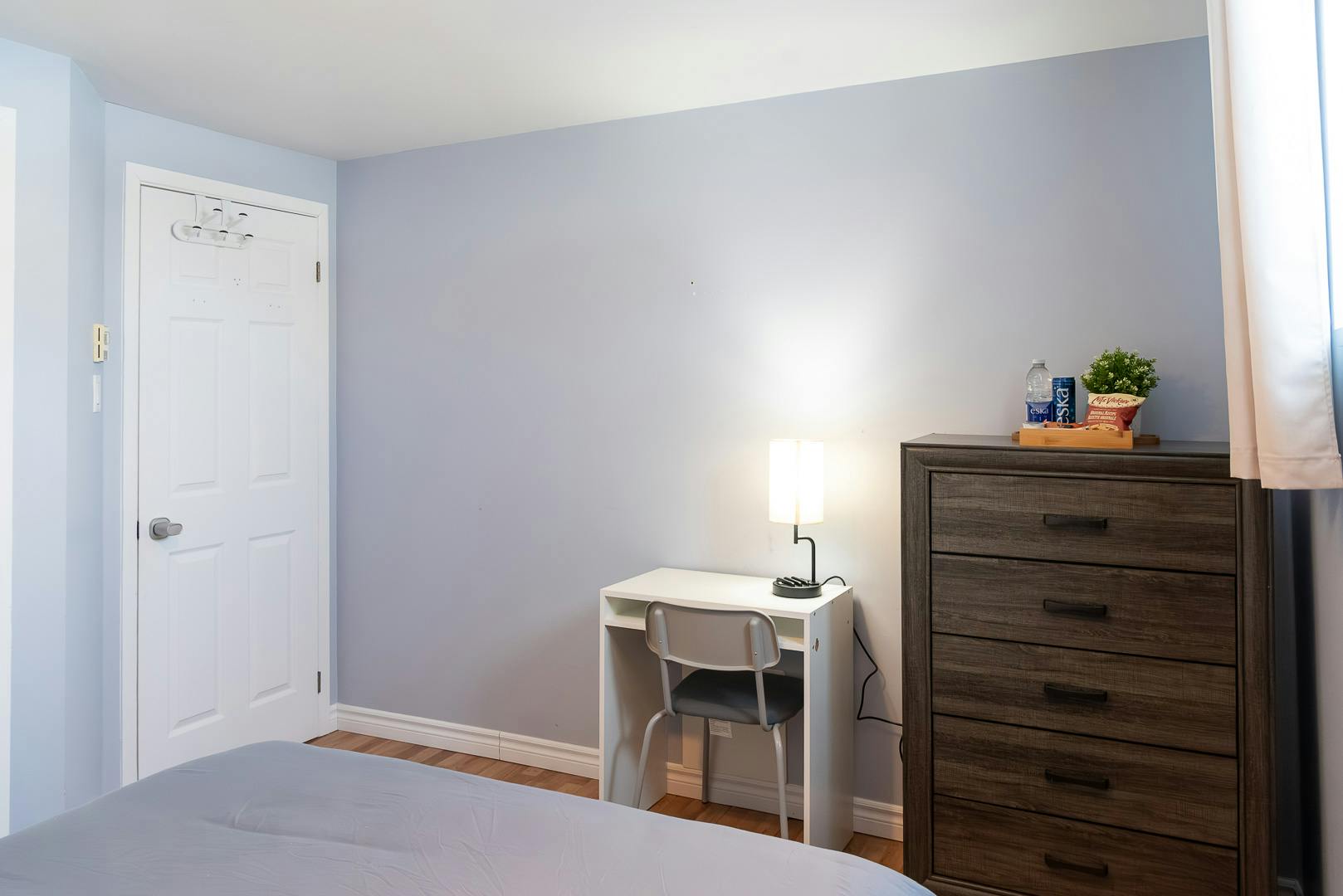 • Small desk with lamp, universal charging station, and USB/USB-C outlet